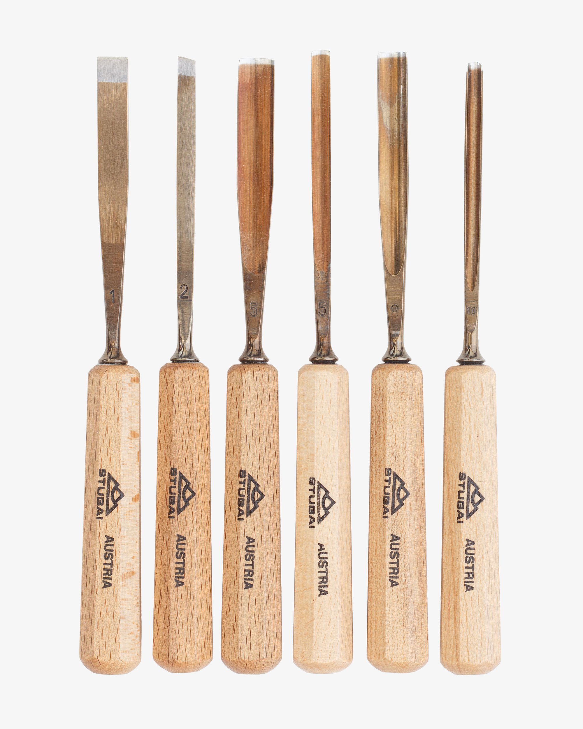 - Ergonomic handles with angular properties that prevent rolling when placed on a worktable. Made from beechwood.